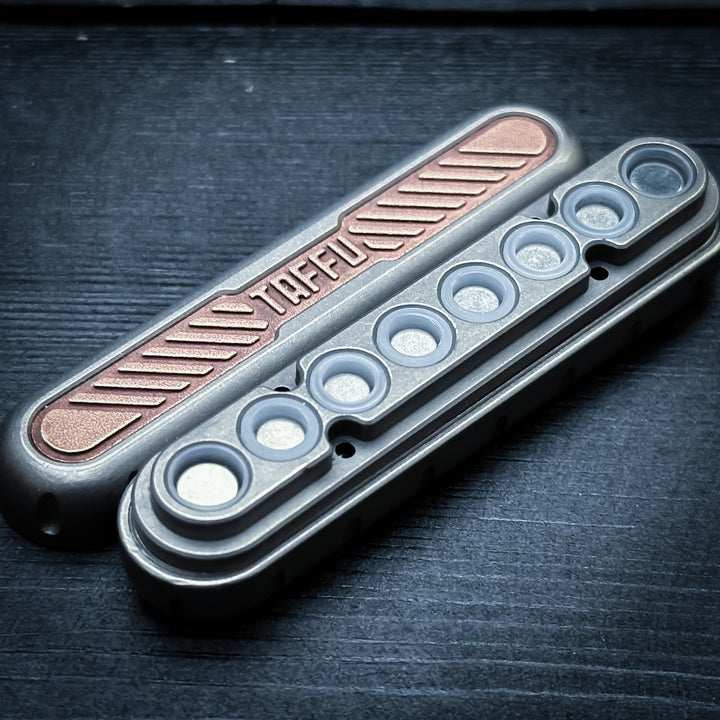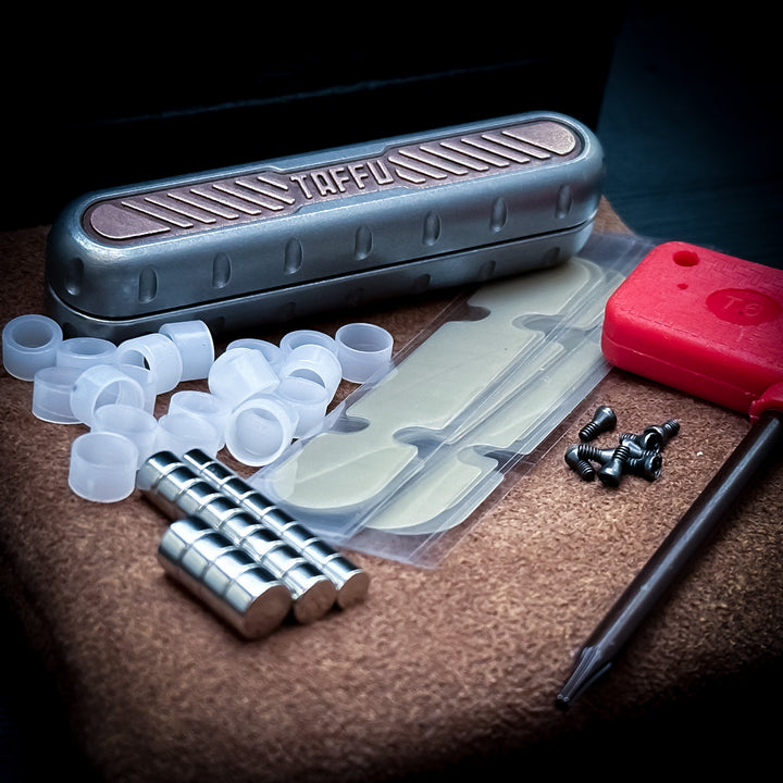 - Content: Inspiration Finger Fidget Slider 1 set, Teflon Lubrication Sticker 8Pcs, 6*3mm N52 Magnets 4Pcs, 5*3mm N52 Magnets 8Pcs, 4*3mm N52 Magnets 8Pcs, 6-5mm Magnets Nylone Liner 8Pcs, 6-4mm Magnets Nylone Liner 8Pcs, M1.6*4mm Hardened Spare Screws 8Pcs, Premium Cow Leather Travelling Bag 1Pc, Screw Driver 1Pc.